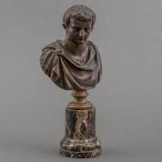 Kleine bronzen buste: keizer Claudius of Augustus, op natuurstenen basement, 21 x 10 x 8 cm