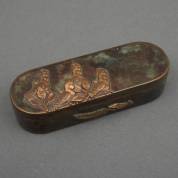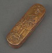 Johann Heinrich Giese (18e eeuw), koperen tabaksdoos, het deksel met reliëfdecor van koning en veroveraar Frederik de Grote, en de onderzijde met door hem veroverde gebieden, Duitsland, 18e eeuw, 3 x 16 x 5 cm