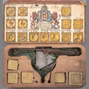 Houten muntgewichtdoosje, de binnenzijde van het deksel met papieren label: 'Gysbert Zilver Eijkmeester En Balancemaker 't Amsterdam, Anno 1770', inclusief 14 gewichtjes en balansje, 2 x 12 x 16,5 cm