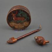 Spaanderdoosje met geschilderd decor van hert en onderschrift: Für heute ruht der Hirsch sich aus der Jägersmannen ging nach Haus', Duitsland, 19e eeuw, daarbij gesneden houten pijp, gemerkt Austria, en een pijpenkop, gemerkt Standard Old Bruyere, beide met reliëfvoorstelling van herten, 6,5 x Ø 16 cm