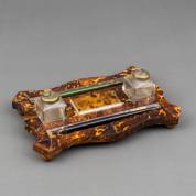 Schildpadbelijmd inktstel met twee inktpotten, twee kroontjespennen, en extra compartiment met dekplaatje, 19e eeuw -kleine defecten-, 7 x 24,5 x 16,5 cm