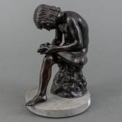 Bronzen beeld: Spinario, naar Romeins voorbeeld, op grijs marmeren basement -enkele kleine krasjes in patina-, 23 x Ø 15 cm