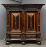 Palissandergefineerde kussenkast met gezwarte profielen en robbellijsten, de deuren geflankeerd door kolommen en aan binnenzijde met ieder drie verborgen lades, de kap met blanco alliantiewapen, Nederlanden, tweede helft 17e eeuw -de houten slotplaat is los, maar wel aanwezig-, 216 x 195 x 80 cm