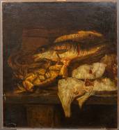 Hollandse School: stilleven met zeebanket, olieverf op doek, naar origineel van Abraham van Beyeren (1620-1690) -beschadiging linksonder-, 70 x 64 cm