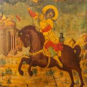 Grote Griekse kerkicoon: Heilige Demetrius van Thessaloniki te paard, terwijl hij de gladiator Lyaeos neersteekt, 19e eeuw, 109 x 74 cm