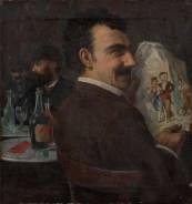 Jaume Pons Marti (1885-1931), lachende man in café, olieverf op doek, l.o. gesigneerd, 30 x 28 cm