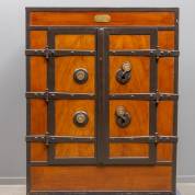 Metalen brandwaarborgkast met gehout decor en ijzeren banden, voorzien van twee verborgen sleutelgaten, de opengewerkte slotplaat met lauwerkransen, uitvoering Hk Kramer en Mr Smit, Amsterdam, 1834, gemerkt aan voorzijde -inclusief sleutels-, 144 x 115 x 50 cm