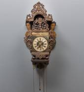 Oost-Friese stoelklok met loden fretten, de bovenste fret met meegegoten naam 'Jacob W. Ufen', Norden, 18e/19e eeuw -beschildering van later datum-, 75 x 36 x 24 cm