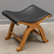 Eiken taboeret met gekruiste poten en zwart lederen zitting, uitvoering Valmaran, Spanje, 20e eeuw -lichte gebruikssporen-, 38 x 46 x 35 cm
