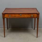 Mahonie thee- of schrijftafel met lade, het blad met uitspringende hoeken, staande op gecanneleerde taps toelopende poten, Hollands, Louis Seize -gebruikssporen, krimpscheuren in blad-, 77 x 102 x 62 cm