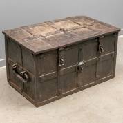 Smeedijzeren geldkist met vierkant bandwerk rondom, sleutelgat aan de bovenkant, twee handvatten aan de zijkant, vermoedelijk Duitsland, eind 17e eeuw -op slot, sleutel ontbreekt-, 46 x 84 x 48 cm