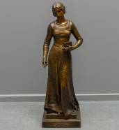 Henri Louis Levasseur (1853-1934), jonge vrouw met lange jurk en bijbeltje, brons, gesigneerd, met opschrift 'A nos Parents, 30 août 1906' -klein ornament in haar rechterhand ontbreekt-, 81 x 25 x 23 cm