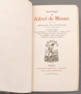 Elf boeken: Musset, A. de (1810-1857). Oeuvres complètes. Paris, A. Lemerre, 1876-1877. 11 delen. Kl.8vo. Donkerblauw half leer met hoeken, rug rijk verguld, kopsnede verguld, andere sneden niet afgesneden. Met titelprent, 11 verschillende portretten in zwart en/of bistre gedrukt en 35 geëtste platen door L. Monziès. Set nr. 47 van de 110 sets gedrukt op Whatman papier -rug licht verbleekt, kleine schaafplekjes langs de randen van de banden-