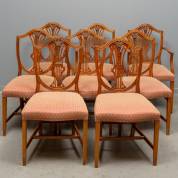 Acht kersenhouten eetkamerstoelen met rode bekleding, Hepplewhite-stijl, waarvan twee stoelen met armleuningen -gebruikssporen-, 90 x 56 x 50 cm