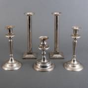 Twee paar verzilverde kandelaars en één losse verzilverde kandelaar, 20e eeuw -lichte gebruikssporen-, 29 x 9 x 9 cm