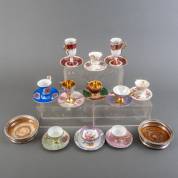 Tien Europees porseleinen kop-en-schotels met vergulde details, één losse kop, en één losse schotel, daarbij: twee verzilverde flessenbakken