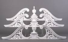 Drie witgelakte ornamenten: doorbroken frontons met urn en gestoken bladdecor, 30 x 114,5 x 8 cm