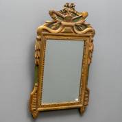 Spiegel in verguld houten lijst met parelrand, bekroond door strikornament, 19e eeuw -slijtages en restauraties-, 72 x 43 x 5 cm
