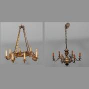 Twee elektrische kroonluchters, de één achtlichts, de ander zeslichts, 95 x Ø 63 cm
