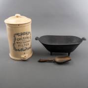 Geglazuurd aardewerk waterfilter, uitvoering Cheavins, daarbij: gietijzeren kolenbak met messing schep, 43 Ø25 cm