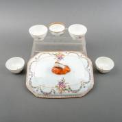 Chinees porseleinen famille rose terrinedeksel met bloemdecor, Qianlong -barst-, daarbij: vier famille rose kommetjes en een kopje -defecten-, 11 x 30 x 23 cm