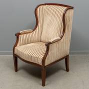 Mahonie oorfauteuil met gestreepte bekleding, begin 20e eeuw, 98 x 65 x 60 cm