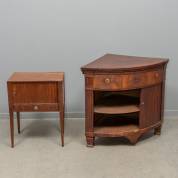 Mahonie hoekkastje, en mahonie pokastje, beide met roffeldeurtje, Hollands, Louis Seize -defecten-, 77 x 64 x 64 cm