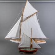 Groot houten modelzeilschip, daarbij: kleiner houten modelzeilschip, beide hedendaags -beide gebruikssporen-, 124 x 110 x 20 cm