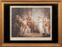 Kleurenstippelgravure: 'Sampson & Dalilah at the gate of the prison', door William Bond (circa 1772-1827), naar schilderij van Henry Singleton (1766-1839), Londen, 1802 -witte vlekjes-, 48 x 58 cm