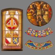 Gebrandschilderd glas-in-lood raam met tekst 'Utrecht-Noord', daarbij: rond gebrandschilderd raam met religieuze voorstelling, en twee gebogen gebrandschilderde ramen -gebruikssporen, enkele gebarsten ruitjes-