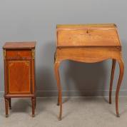 Mahonie damesbureautje met bloemintarsia en verguld messing beslag, en mahonie halkastje met messing beslag, beide Louis Seize-stijl, 20e eeuw -bureautje met defecten en vlekken in fineer-, 92 x 71 x 44 cm