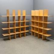 Twee open vakkenkasten, met licht grenen gefineerd, hedendaags -gebruikssporen, verstevigingskruizen ontbreken-, 160 x 160 x 32 cm