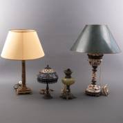 Vier diverse tafellampen: één van porselein, één van messing en steen, één van glas-in-lood, en één van messing met glazen reservoir, 69 x Ø 50 cm