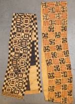 Twee lange raffia wandkleden met geometrische patchworkmotieven, Kuba, Democratische Republiek Congo, laatste kwart 20e eeuw -gebruikssporen-, 656 x 65 cm
