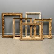 Vijf middelgrote lijsten met reliëfdecors -wisselende conditie-, sponningmaat grootste lijst 76 x 61 cm, 90 x 72 x 3 cm