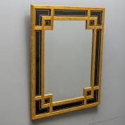 Rechthoekige spiegel in goudkleurige houten lijst, tussen de opengewerkte delen zit zwart spiegelend glas, modern, 93 x 72 x 3 cm