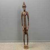 Groot Afrikaans houten beeld van vrouw met ruitvormige navel, Senoufo, West-Afrika, 160 x 25 x 25 cm