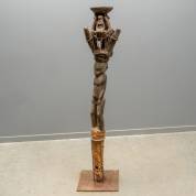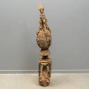 Afrikaans houten voorouderbeeld, het hoofd getooid met een rijk gestoken kom, vermoedelijk Lobi, Ghana, op metalen basement, 148 x 35 x 35 cm