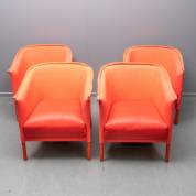 Vier stoelen bekleed met koraalrode stof op rood houten onderstel, model Talo, ontwerp Sebastian Herkner, uitvoering Sancal, 76 x 68 x 70 cm