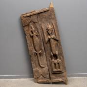 Afrikaanse houten deur van graanopslag met decor van voorouder en krokodil, Dogon, Mali -scheur met reparatie-, 143 x 58 x 5 cm