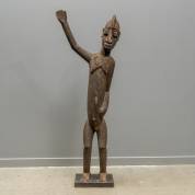 Groot Afrikaans houten fetisjbeeld: man met opgestoken arm, bekleed met kippenveren, Lobi, Ghana -resten van polychromie-, 120 x 40 x 18 cm