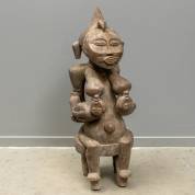 Groot Afrikaans houten vruchtbaarheidsbeeld: zittende moeder met twee kinderen, Chokwe, Zambia, 96 x 35 x 35 cm