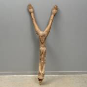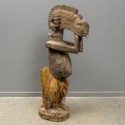 Afrikaans houten beeld: vrouw met gewei in de vorm van twee uitgestrekte armen, gesneden uit Y-vormig stuk hout, 145 x 52 x 10 cm