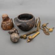 Twee messing Ottomaanse divits, een messing olielampje in de vorm van een olifant, en een paardenbit en stijgbeugels gedecoreerd met Arabische tekst en kroon, daarbij: een kanonskogel, gezwart houten kom en lederen waterfles -gebruikssporen-, 85 x 81 x 35 cm