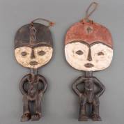 Paar Afrikaanse houten beeldjes: man en vrouw met witte gezichten, Ashanti, Ghana, 44 x 22 x 7 cm