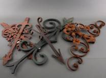 Diverse smeedijzeren en ander metalen ornamenten waaronder: muuranker -gebruikssporen-, 97 x 48 cm