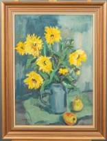 Hollandse School: stilleven met zonnebloemen, olieverf op doek, l.o. onduidelijk gesigneerd, 70 x 50 cm