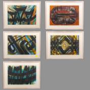Ben Hoezen (1935-2022), vijf abstracte werken, acrylverf op papier, alle r.o. gesigneerd en gedateerd, daarbij: boekje over het werk en leven van de kunstenaar, 38 x 54 cm