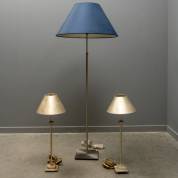 Eén aluminiumkleurige vloerlamp met blauwe kap, daarbij: paar tafellampen met zilverkleurige kap, modern -lichte gebruikssporen-