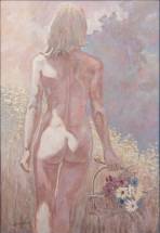 Jules Berkhof (1910-1993), naakte vrouw met bloemenmand, olieverf op board, l.o. gesigneerd, 79 x 55 cm
